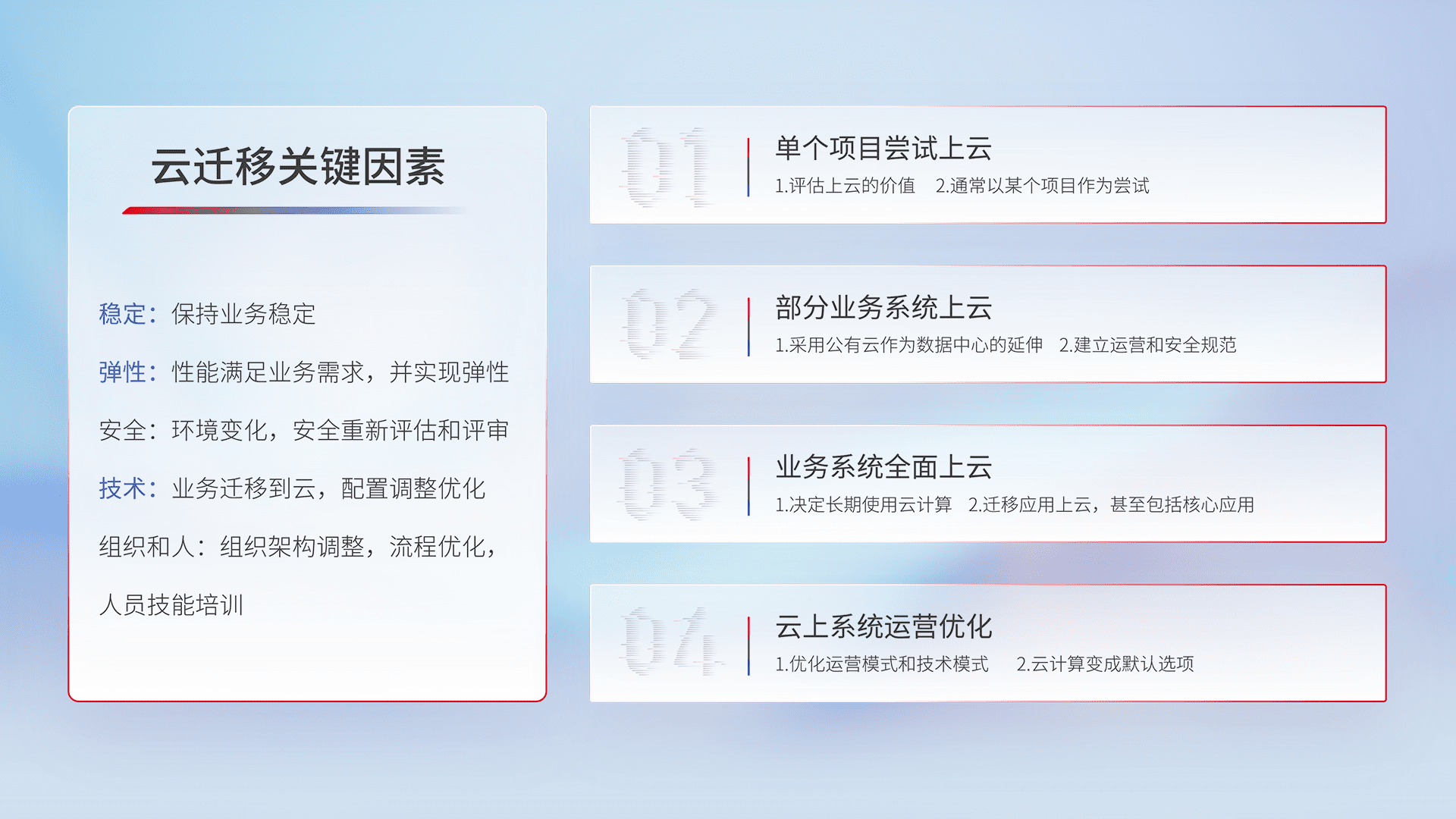 结合实际业务,,,,从规划设计、、云平台选型、、云原生改造、、、数据迁移、、、集成交付,,迁移全过程为客户识别最佳上云路径,,做好风险识别管理,,设计网络架构、、身份权限、、、安全审计合规、、、、操作审计、、日志审计、、、监控告警策略、、、、多站点容灾设计等,,,,对云上基础设施进行整体规划,,,,提升IT治理水平,,,,以满足弹性、、、高可用、、、高性能的需求。。。。