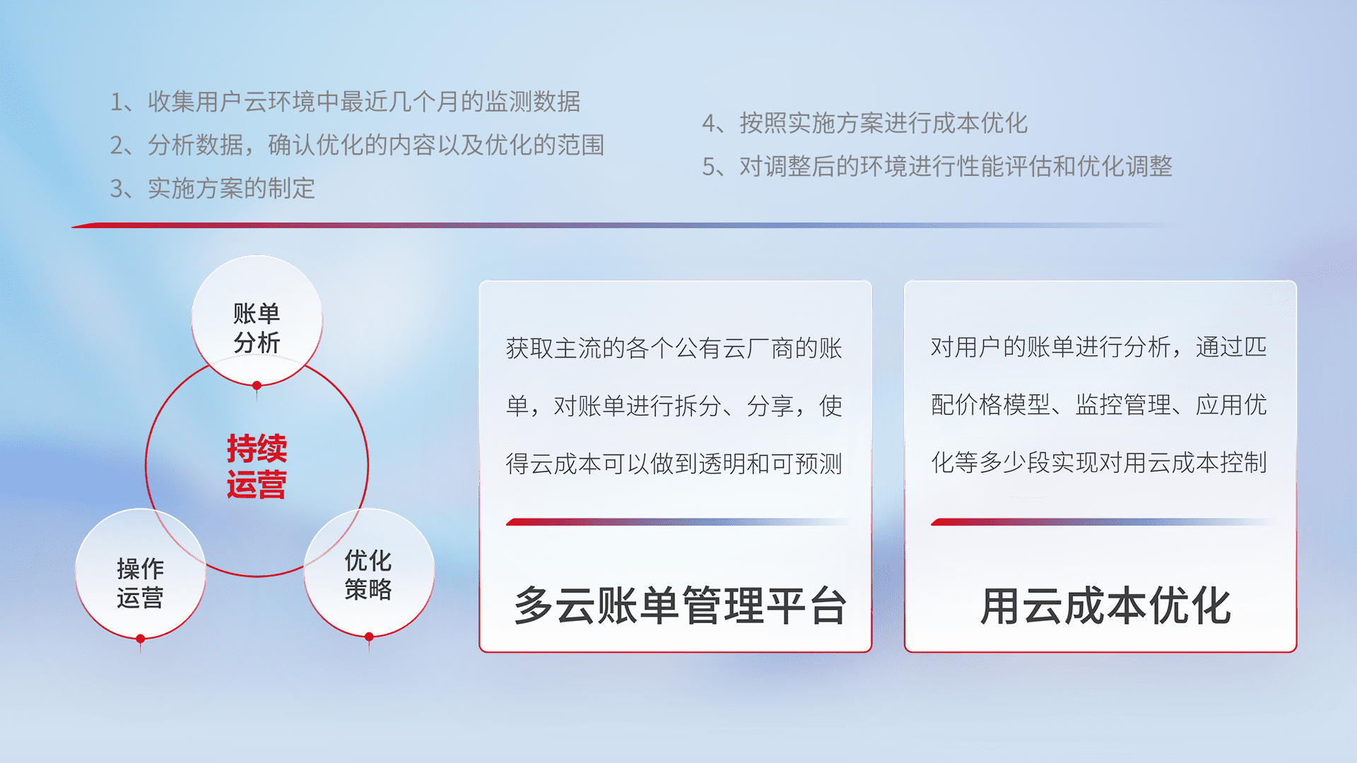 通过多云纳管,,,,以统一的资源数据模型把客户的云资源进行抽象和封装,,,,进而实现对多云资源的统一操作,,,保障云资源管理的可靠性、、、、稳定性与可用性。。量身定制化运维内容,,配置、、、开发运维、、、、补丁管理、、备份、、监控、、、、认证和访问管理、、、、审计和日常巡检等,,保障在用云过程中的可靠度,,,,稳定度以及高可用率。。。